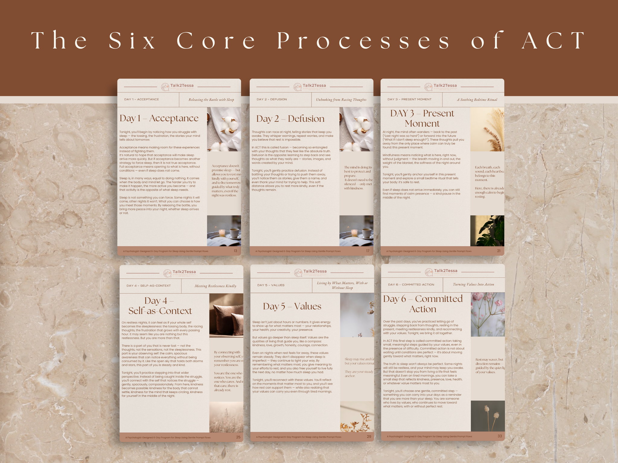 Learn to let go of the battle with sleeplessness, step back from racing thoughts, meet restlessness with kindness, and reconnect with what matters most. This 6-day digital program blends Acceptance & Commitment Therapy (ACT), self-compassion practices, and AI Coaching Prompt Flows — guided scripts you can paste into any free AI chat for warm, adaptive, step-by-step support.
